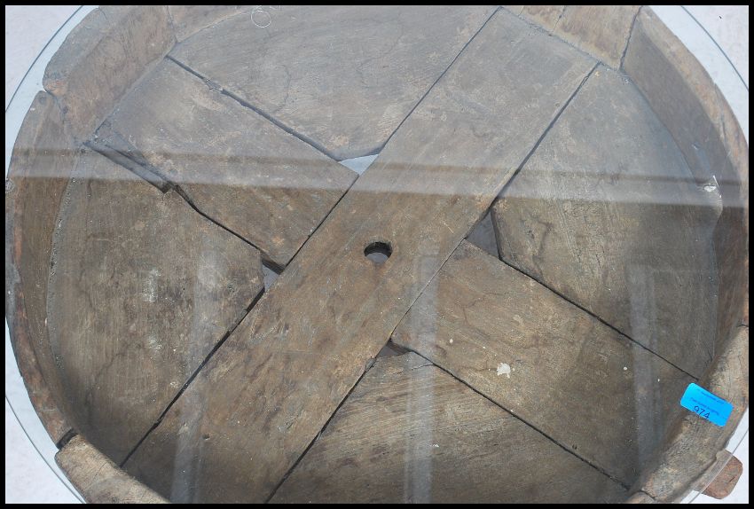 A 19th century rustic up cycled coffee table. Constructed from an Asian flour  / grain mill, raised on four shaped and carved legs, carved details to the side with heavy glass top. Measures 125cms x 42cms x 11cms.