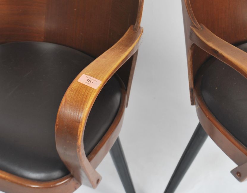 An exceptional pair of Danish mid century armchairs in the manner of Cherner for Plycraft. Each being raised on tapering legs with pad vinyl upholstered seats beneath stunning bentwood arch panel back rests with elbow rests either side.