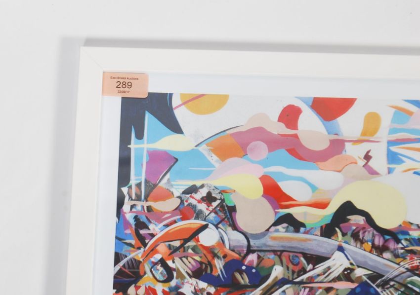 A graffiti urban art print after Bristol Street artist Minto entitled Back by Pope Demand 2014 9/10. Framed and glazed Giclee print. Measures 50cms x 40cms.