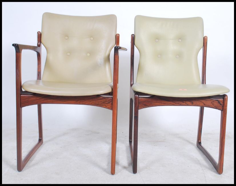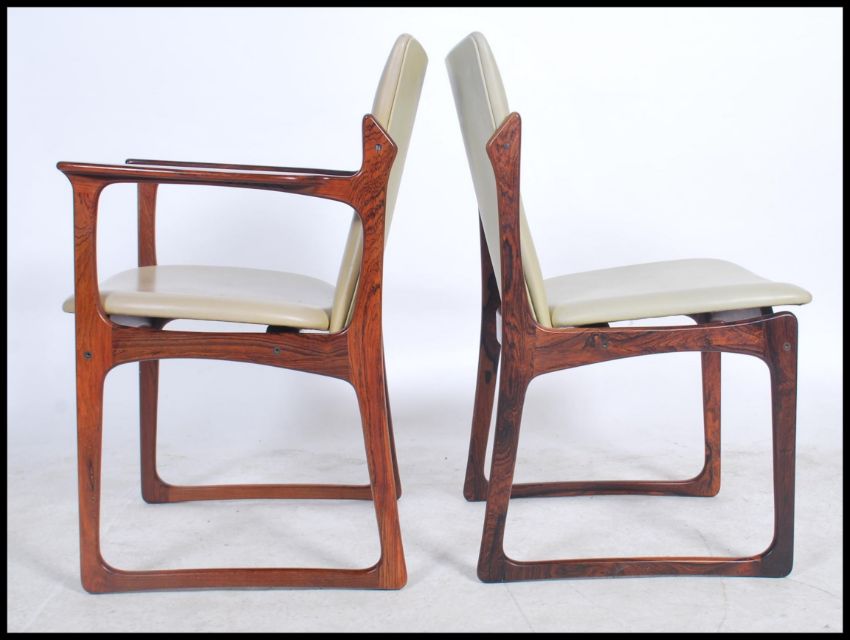 An exceptional set of Danish dining chairs from the mid 20th century being shaped and chamfered to the edges being upholstered in cream leather fabric. Measures: 85cm high x 61cm wide x 55cm deep.