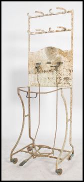 A 1930's Art Deco French Industrial metal painted medical / surgical instrument stand bearing makers plaque to the centre. The base on original castors with metal upright back panel with recesses and stands