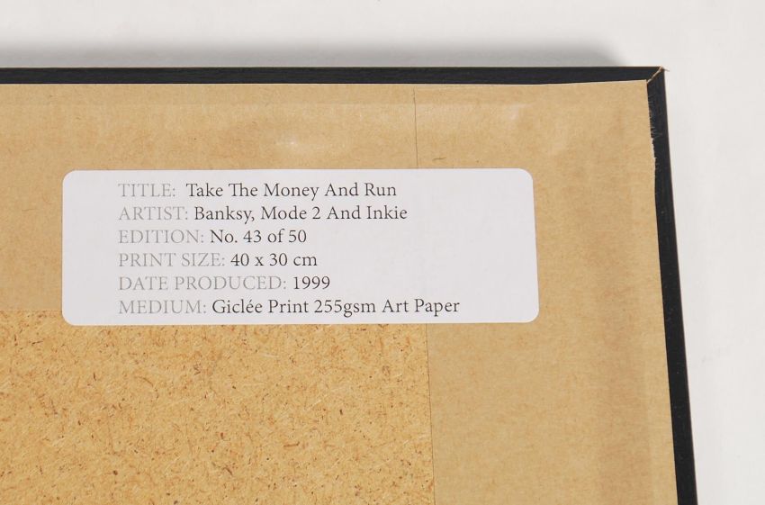 A graffiti urban art print after Bristol Street artist Banksy entitled Take The Money And Run 1999  number 43/50 framed and glazed on giclee paper. Measures 42cms by 30cms.