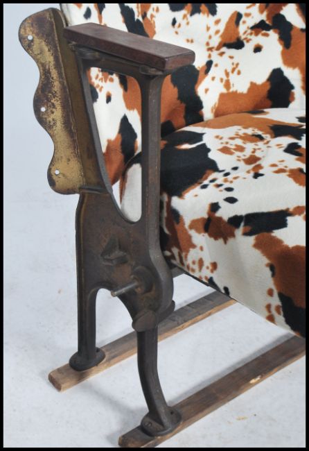 A vintage retro 20th century 1920s set of folding cinema seats recovered in faux horse hair along with a pair of matching cube faux horse hair footstools. Measures: 82cm high x 109cm wide x 28cm deep.