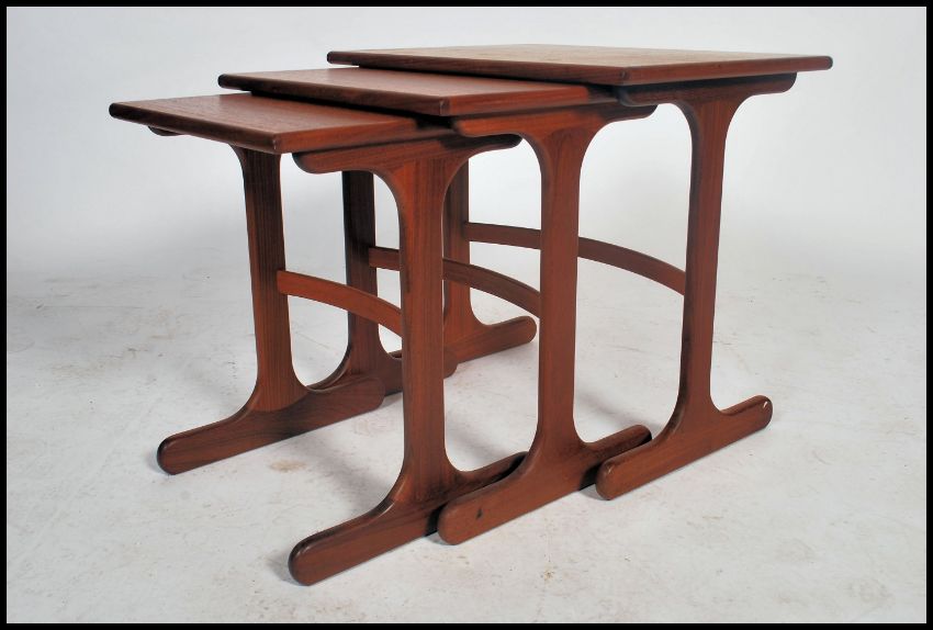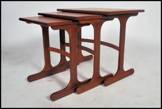 A 1970's / 20th century G-Plan teak wood nest of three inter-sliding occasional tables, raised on trestle end supports united by central stretchers, complete with the red G-Plan sticker.