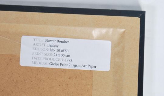A graffiti urban art stencil print after Bristol Street artist Banksy entitled Flower Bomber 1999  number 10/50 framed and glazed on A4 giclee paper. Measures 21cms by 30cms.