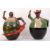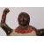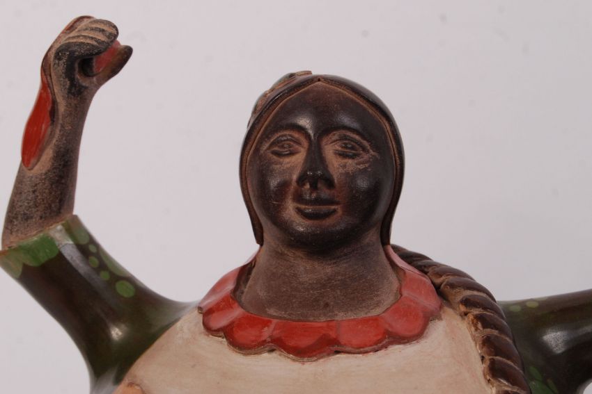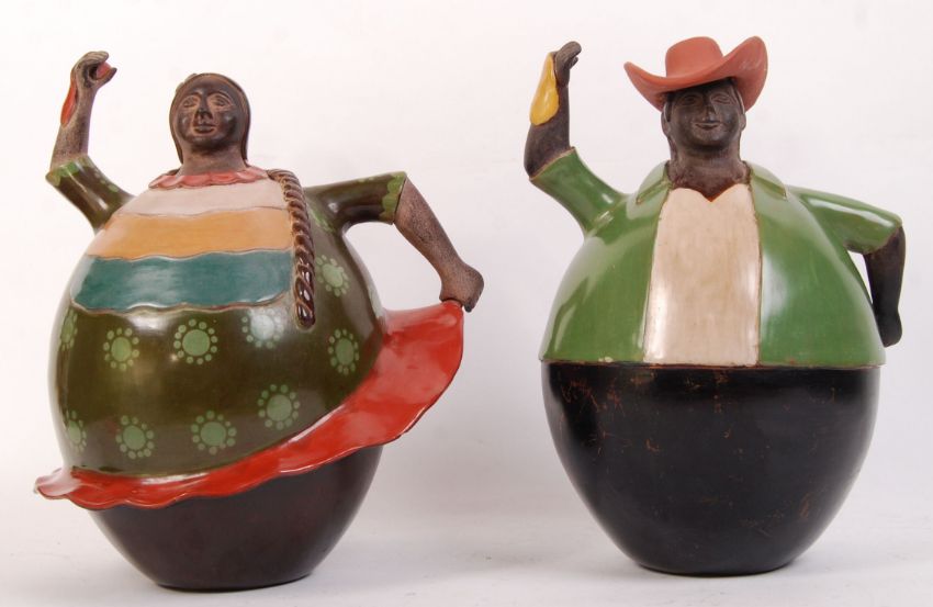 A pair of unusual large Peruvian terracotta handpainted oversized character figurines of a lady and a gentleman dancing bearing inscription to the base