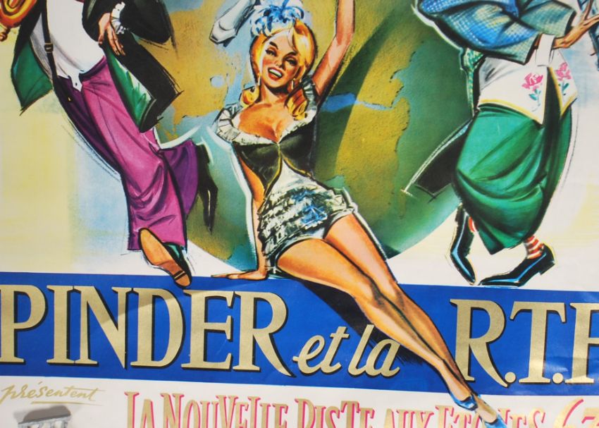An original vintage French circus advertising poster featuring  clowns, muscians, jester and showgirl dating to 1963 from the famous Pinder Circus. Further notation atop for Pinder et la RTF ( Les Rivels )  - La Nouvelle Piste aux Etoiles 63, une realisation de Gilles Margaritis. Part of a rare collection of French circus posters offered in this sale.
