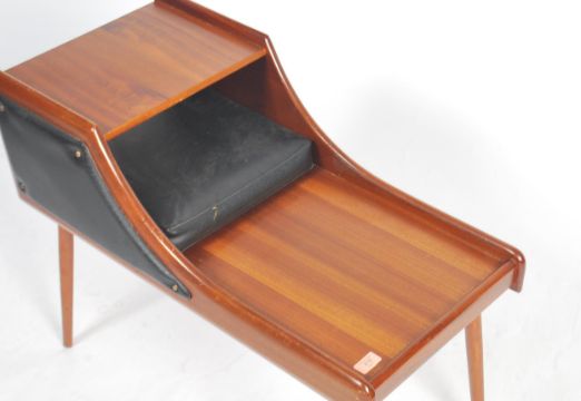 A good 1970's retro teak wood telephone - side table being raised on tapering turned legs with black vinyl pad seat having angular teak raised top over open storage recess. 61cms high x 79cms wide x 39cms deep