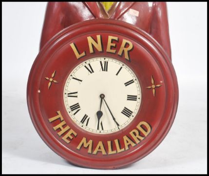 A superb large 20th Century Railway inspired wall mounted clock constructed out of fiberglass, the deep round clock face having an English gentleman with a bowlers hat, tie and jacket being formed out of the top. The clock body being in red with lettering LNER ( London to North East Railway ). Measures: 100cm high x 55cm wide x 30cm deep.