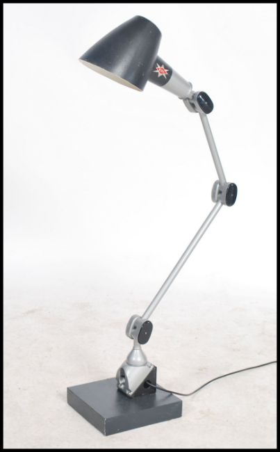 An original industrial factory anglepoise lamp by EDL. A multi adjustable arm with switch to base and enamel shade, the lamp being mounted to a painted wooden plinth.  Measures: 85cm high.