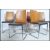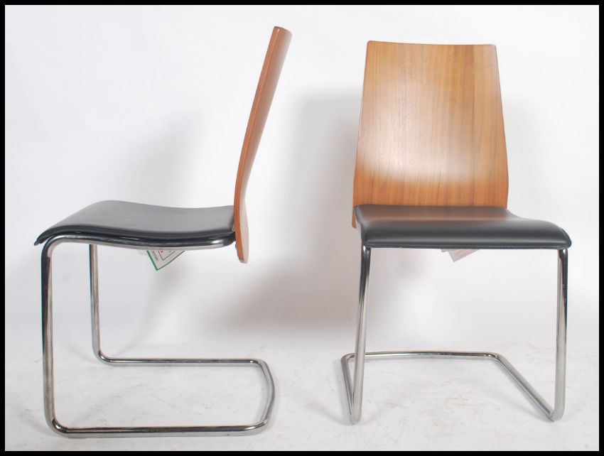 A set of 6 contemporary Calligaris 20th century Italian cantilever dining chairs having chrome tubular metal frames with black pad seats and walnut panel back rests.  Measures: 86cm high x 45cm wide x 42cm deep.