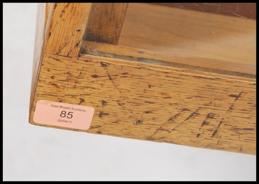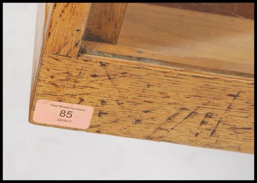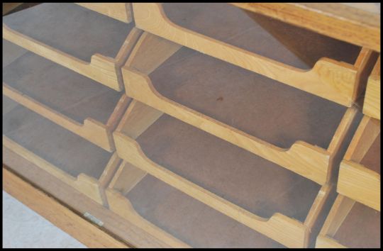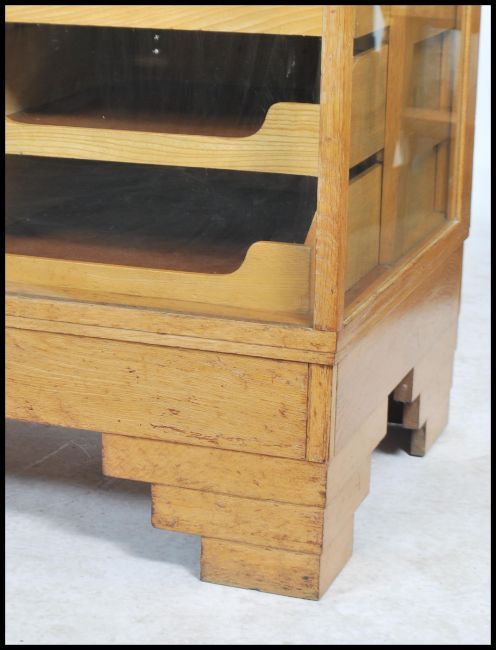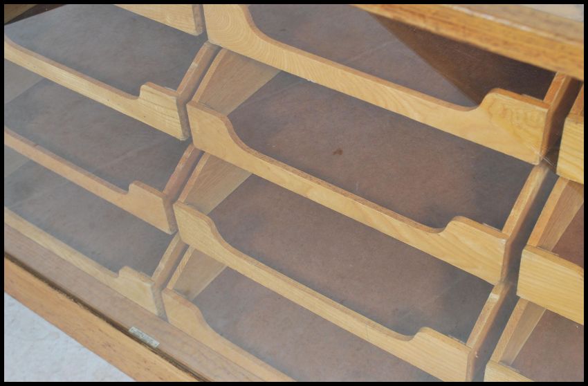 A stunning early 20th century Art Deco twenty drawer vintage haberdashery shop display cabinet counter fitted solid oak drawer fronts and handles, glass top, sides and back raised on stepped deco block feet.  Measures: 92cm high x 178cm wide x 58cm deep.