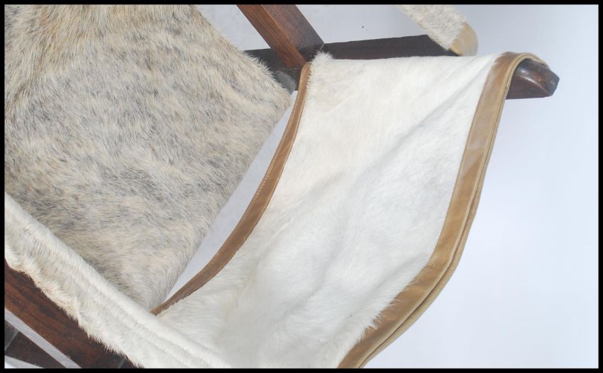 A pair of mid century bentwood and pony hide / skin safari chairs in the manner of Kaare Klint. Each chairs with dark bentwood frames having pony hide upholstered seats and back rests.  Measures: 63cm high x 58cm wide x 74cm deep.
