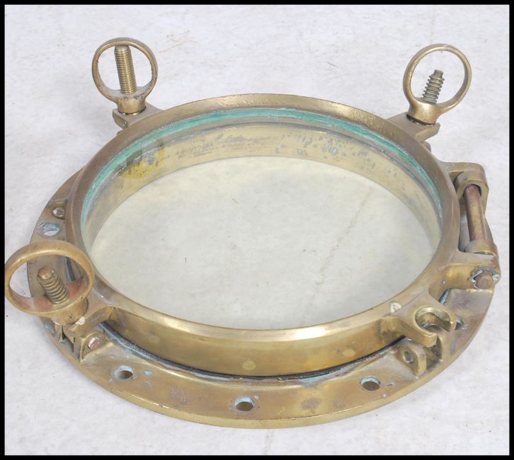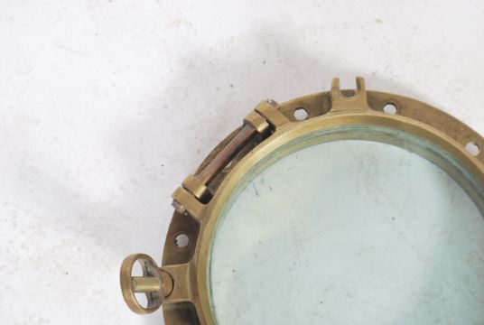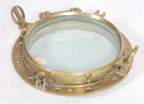 A stunning  early 20th century brass shipping porthole window's with backing plates on  fitted hinges and fixing lugs.  Measures: 42cm diameter.