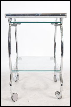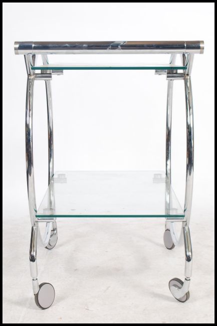 A 1930's style Art Deco chrome and glass butlers serving trolley. Raised on castors with circular chrome frame having fitted twin glass tiers. Measures: 81cm high x 72cm wide x 34cm deep.