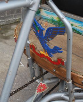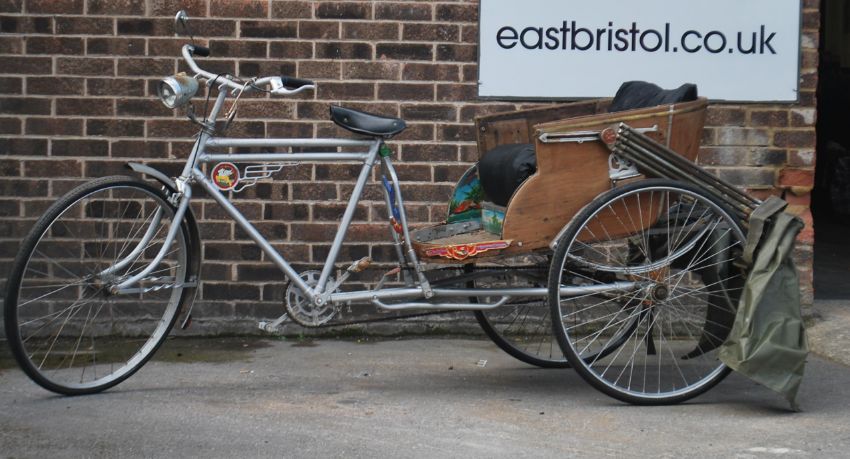 An original Indian / Thai rickshaw with the original paintwork and emblem with makers plaque. Complete with brooks saddle, the wooden seat with canopy hood