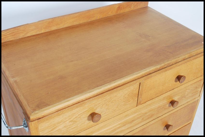 A superb air ministry two over three chest of drawers having a gallery back and a towel rail to the right side.  Measures: 84cm high x 90cm wide x 50cm deep.