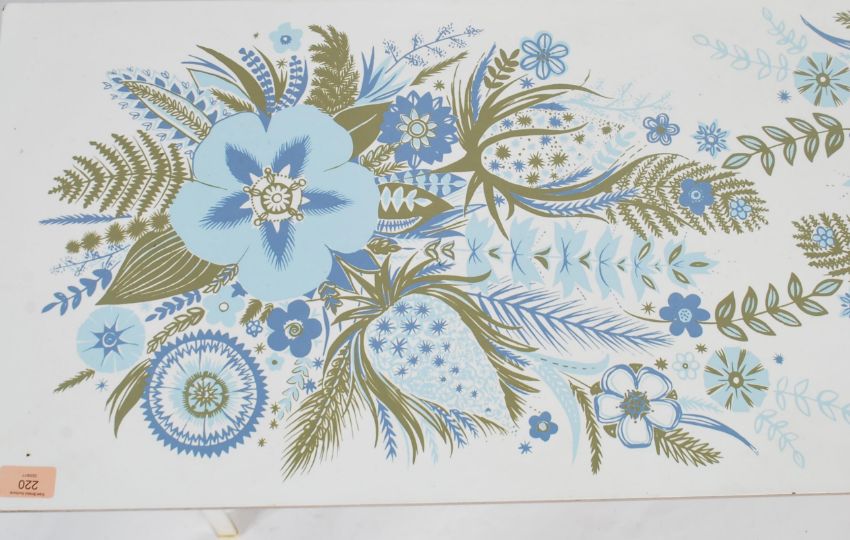 A 1960's / 1970's Terence Conran for Habitat longjohn coffee table being raised on painted metal legs with long formica top above having floral decoration. 36cms high x 114cms wide x  38cms