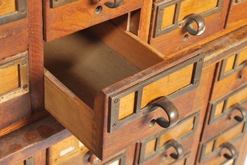 An exceptional early 20th century large Industrial oak index filing cabinet on stand. Raised on a squared tapering leg base with a tall heavy oak body adorned with multiple banks of drawers. Each with hook handles and notation slides. Dismantles into 2 pieces for ease of movement. 152cms high x 109cms wide x 48cms deep