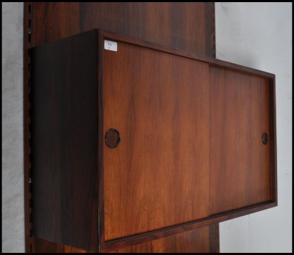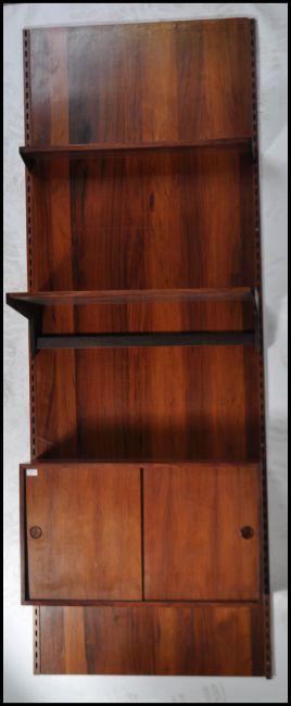 A rare mid century Danish modular wall system having a large panel back with rail ends. The board surmounted by a shaped deep shelf and a sliding door cabinet with appointed interior to include 2 white plastic trays. Measures 244cm high x 85cm wide.This item complete with Article 10 certificate.