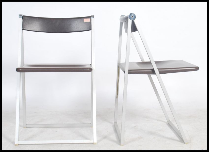 A pair of original 1970's / 1970's Italian stainless steel and brown resin cast Interlubke folding chairs being stamped verso