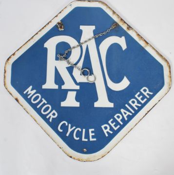 An original and rare RAC motor cycle repairer enamel advertising double-Sided advertising Sign of lozenge form with blue and white colourway.
