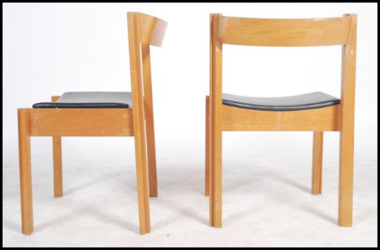 A set of 6 beech and vinyl upholstered stacking and interlocking chairs by Clive Bacon dating to the 1960's. The chairs with squared shaped legs allowing them to interlock and create a run of chairs also having the original black faux leather seat and back rests. Measuring 75cm high x 50cm wide x 49cm deep.  Measures: 75cm high x 50cm wide x 50cm deep.