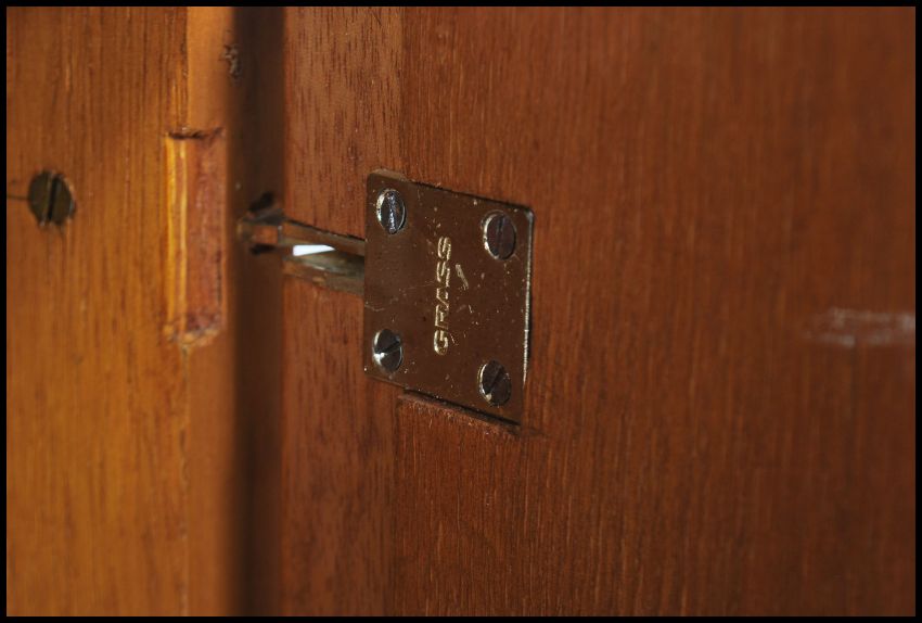A 1950's Post Modernist teak wood sideboard having central bank of blind front drawers with cupboards to the sides. the cupboards with octagonal panel work facia's