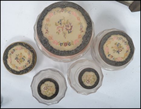 An art deco vanity set to include a brush, mirror, powder puff and perfume / scent bottles. measures 36 cm widest