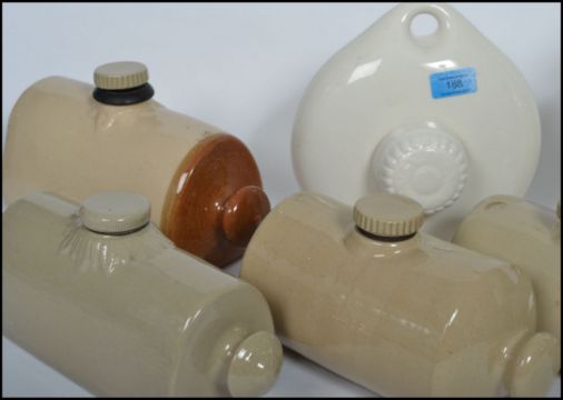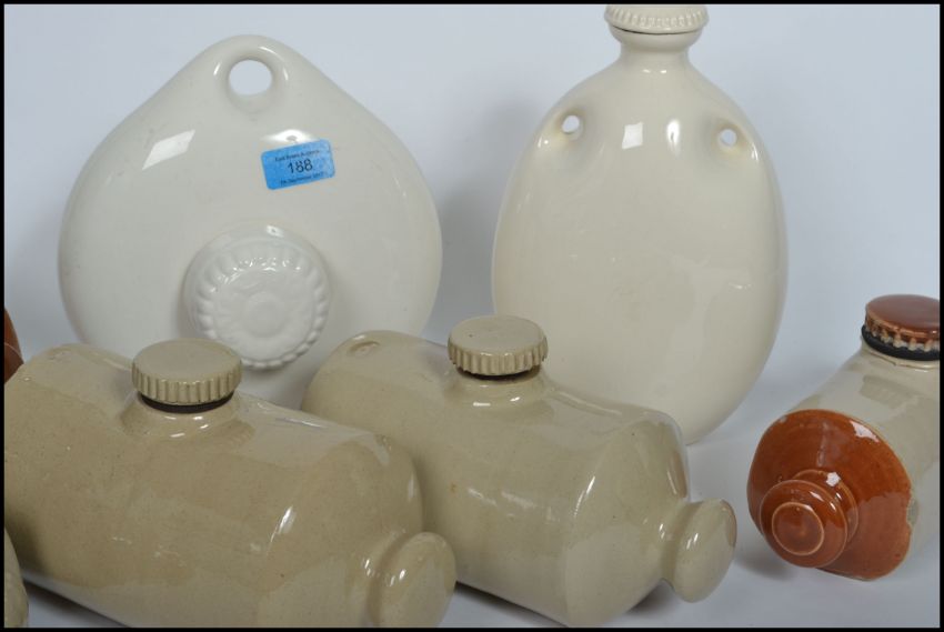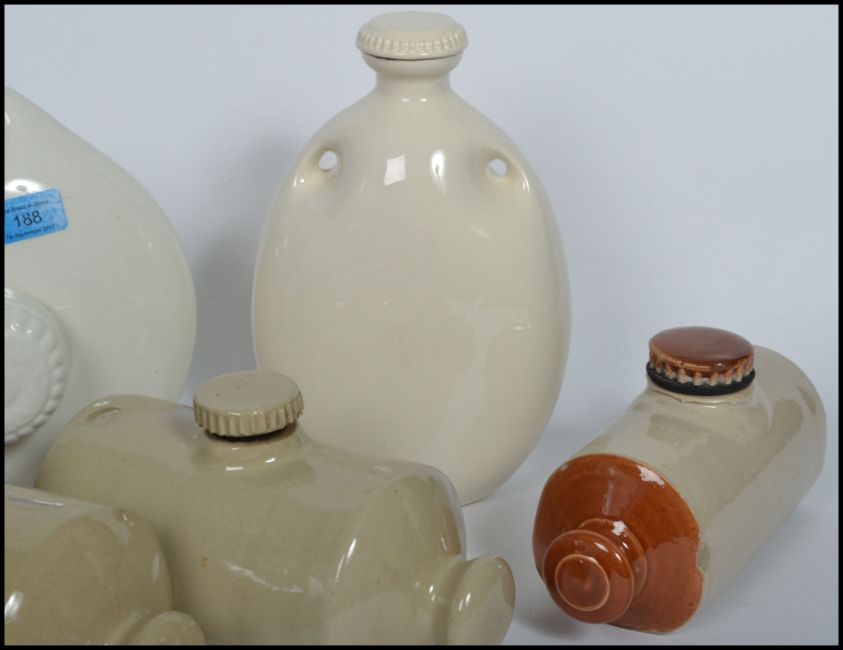 A collection of vintage 20th century stoneware ceramic hot water bottles of varying form and shape to include a moon flask shaped Royal Doulton with A letter stamp.