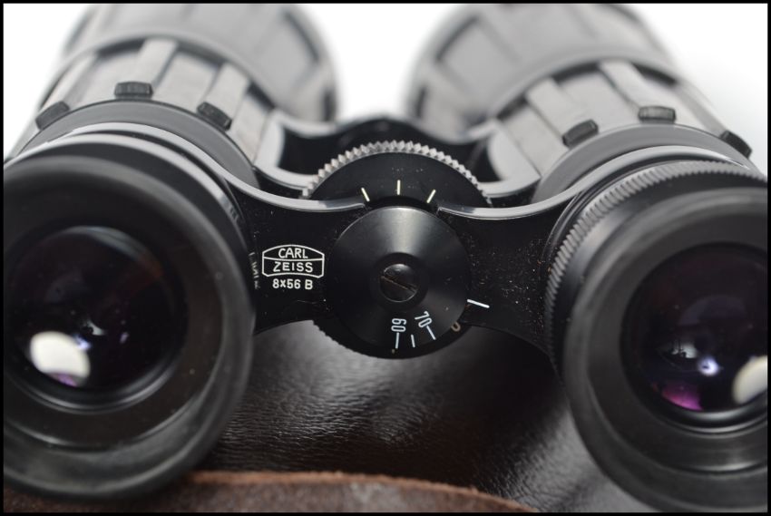 A good pair of original Carl Zeiss 8x56 B Dialyt binoculars complete in the leather case with rubber eye piece guard and shoulder strap. The binoculars marked to top etc ( see illustrations). Measures 26 cm high.