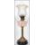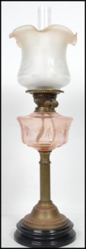 An early 20th Century oil lamp having a flute and tulip style shade raised above a faceted reservoir on top of a cast metal terraced base.