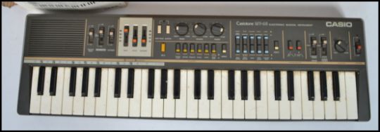 A vintage Casio Casiotone MT-68 electric portable piano complete in original box. Measurements: 7 cm high, 64 cm wide and 19 cm deep.