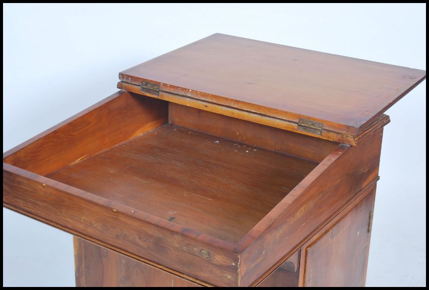 A late 19th early 20th century yew wood Davenport desk of simple form with inset writing slope with tooled leather scribe with a single panel door to the side. Measures 77.5cms x 81cms x 58cms