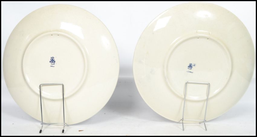Two 20th century Delft ceramic wall hanging charger plates each having a central tondo depicting an equestrian scene with leaf and flower border work. Stamped to back Delfts Blauw Chemkefa.