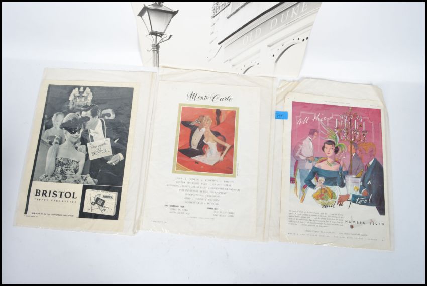 A small collection of advertising / point of sale prints advertising Bristol tipped cigarettes, Casino Monte Carlo, Number Seven Cigarettes and a large photograph of The Duke pub Bristol. Measurements: 51 cm high and 40 cm wide.