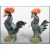 A pair of hand painted 20th century Majolica cockerels raised on naturalistic plinth bases having continental marks to base with a rose. Numbered 4158 347/2. Measurements: 17 cm high, 9 cm wide and 11 cm deep.