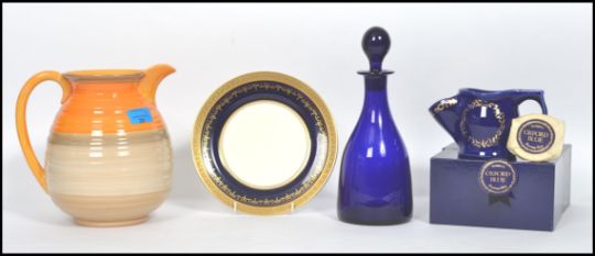A large early 20th century Shelley jug having a banded bee hive design with shaped handle and lip along with a Victorian Bristol Blue glass decanter having a tapering neck with flared rim, ball finial stopper and polished pontil mark to base, an Aynsley Georgian Cobalt cabinet plate with gilt decoration and a Geo F Trumper boxed ceramic shaving mug in the Oxford blue pattern. Tallest measures 27cms high. Condition Report: all items appear in good order the shaving mug appears unused the decanter stopper fits and removes correctly, some paint loss to lip of the Shelley jug.