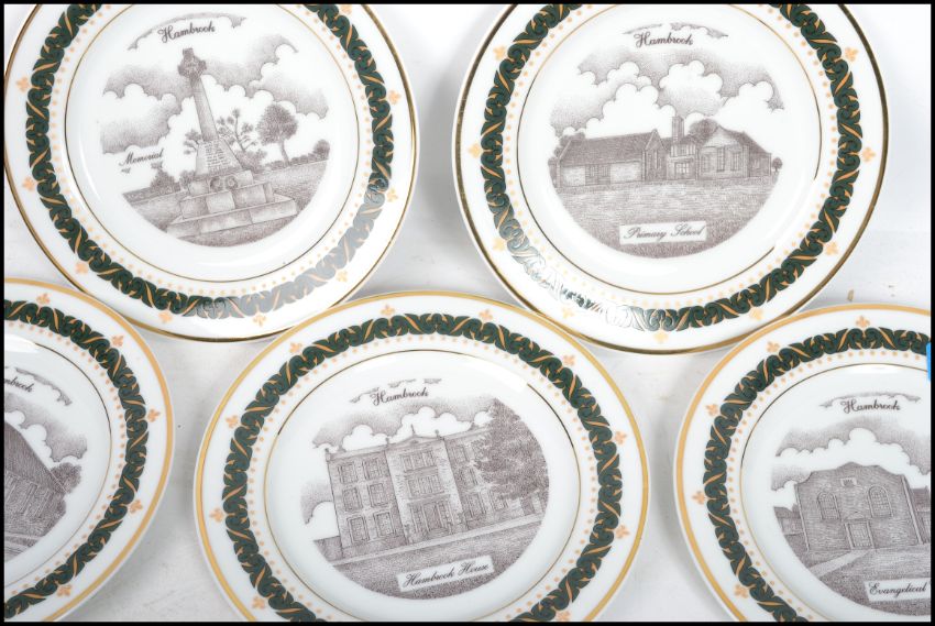 A collection of six souvenir plates for Hambrook Bristol, each a different design of a local landmark from Hambrook.