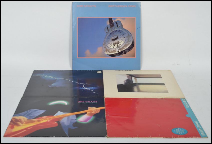 A group of five long play LP vinyl records by Dire Straits to include Money For Nothing, Making Movies, Brothers in  arms, Love Over Gold and Dire Straits.