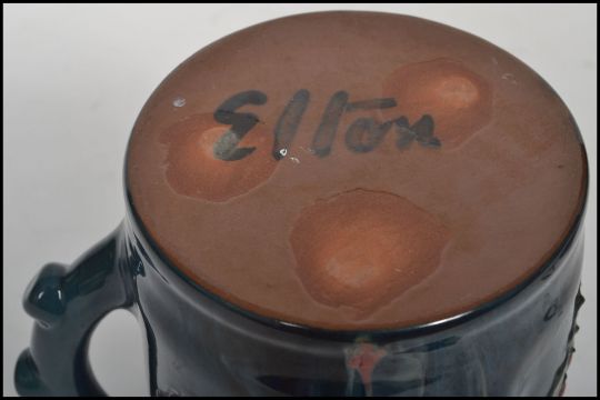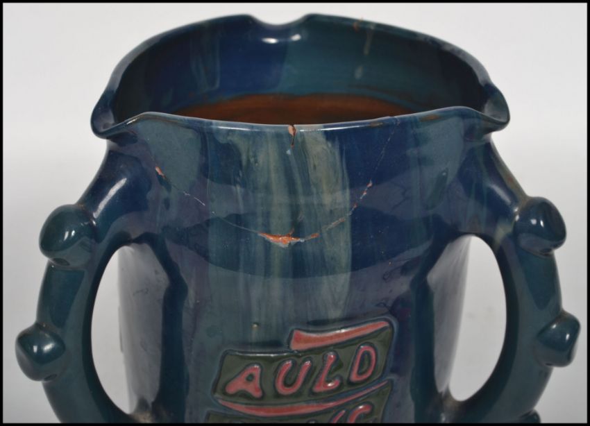 An Elton ware three handled loving jug having tube lined flowers in strawberry colourway with a blue and purple ground, three spouts to the rim and prunted handles. repair to rim.  Measurements: 20 cm high, 19 cm wide and 19 cm deep.