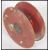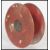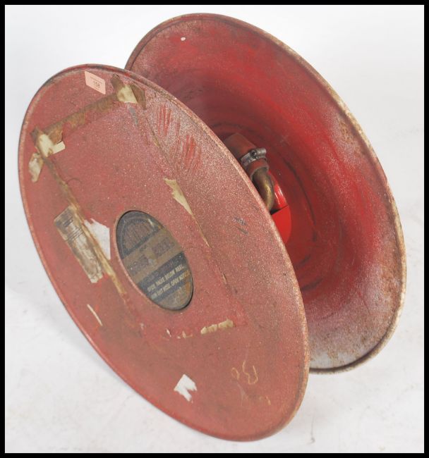 A vintage fire hose reel in red, having wall mount attached to one side.