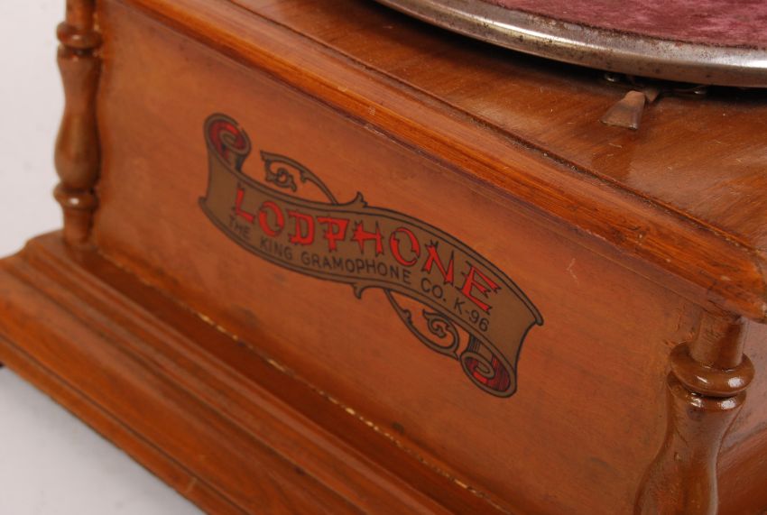 A 20th century mahogany cased Lodphone table top gramophone with good 78 deck having baize lining and notation to the stand with a fabulous oversized brass trumpet. 73cms high