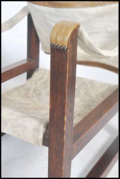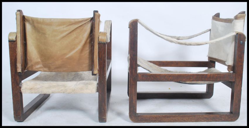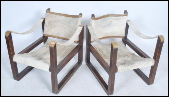 A pair of mid century bentwood and pony hide / skin safari chairs in the manner of Kaare Klint. Each chairs with dark bentwood frames having pony hide upholstered seats and back rests.  Measures: 63cm high x 58cm wide x 74cm deep.