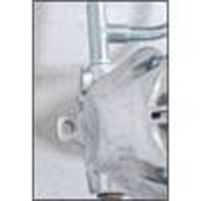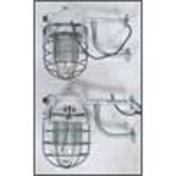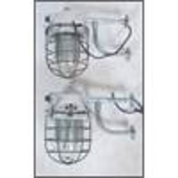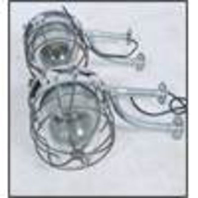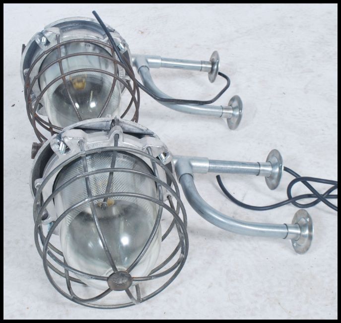 A pair of Industrial ' extreme condition ' heavy industrial bulkhead lights. Each with glass pendant shades being caged having polished metal bodies with wall bracket mounts. Polish origin with manufacturers notation to the tops. Further matching lights in lots 288. 39cms x 34cms