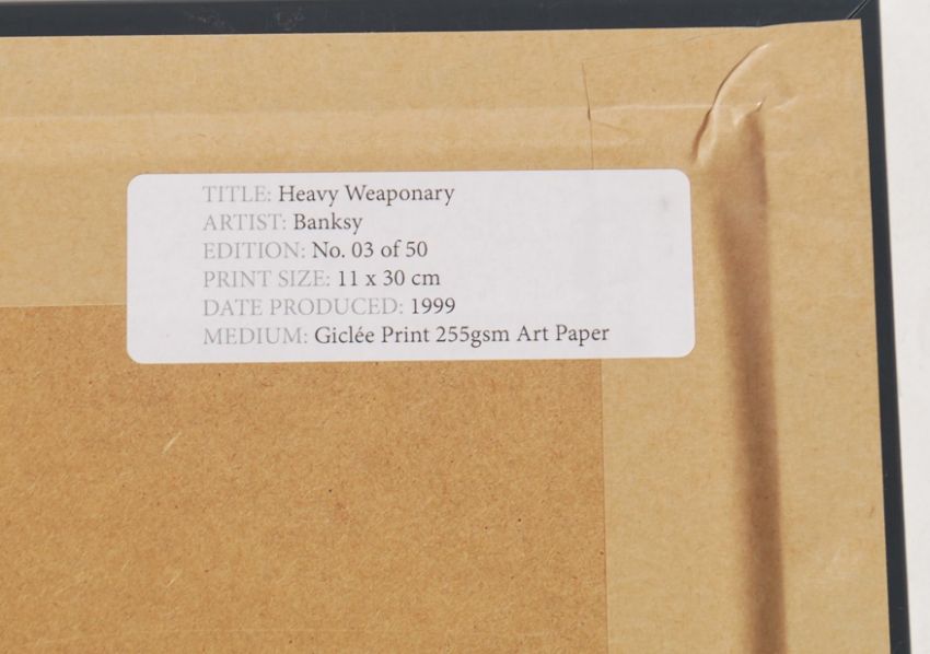 A graffiti urban art stencil print after Bristol Street artist Banksy entitled Heavy Weaponary 1999  number 11/50 framed and glazed on A4 giclee paper. Measures 21cms by 30cms.
