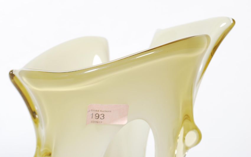 A large 20th century Murano glass Empoli vase of pierced form being handblown and in a stunning yellow / taupe colourway. Measures 45cms high