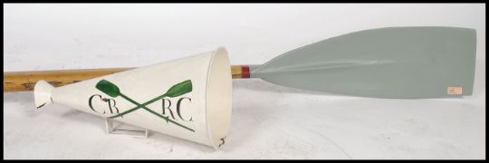 An original full size wooden rowing oar by Ayling together with a fabulous early 20th century Loud Hailer of conical form in white with coat of arms and monogram for CB