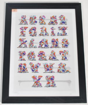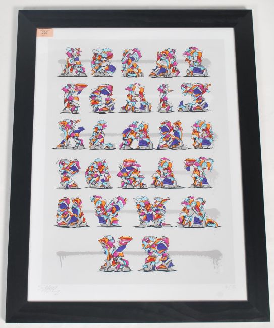 A graffiti urban art print after Bristol Street artist Deamze entitled Alphabetical Weaponry 2014 04/15 . Framed and glazed Giclee print. Measures 42cms x 60cms.