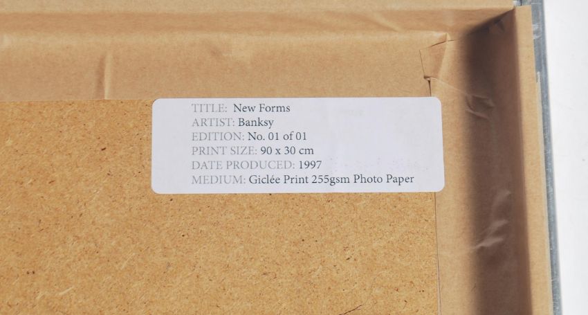 A graffiti urban art print after Bristol Street artist Banksy entitled New Forms 1997  number 1/1 framed and glazed on giclee paper. Measures 90cms by 30cms.